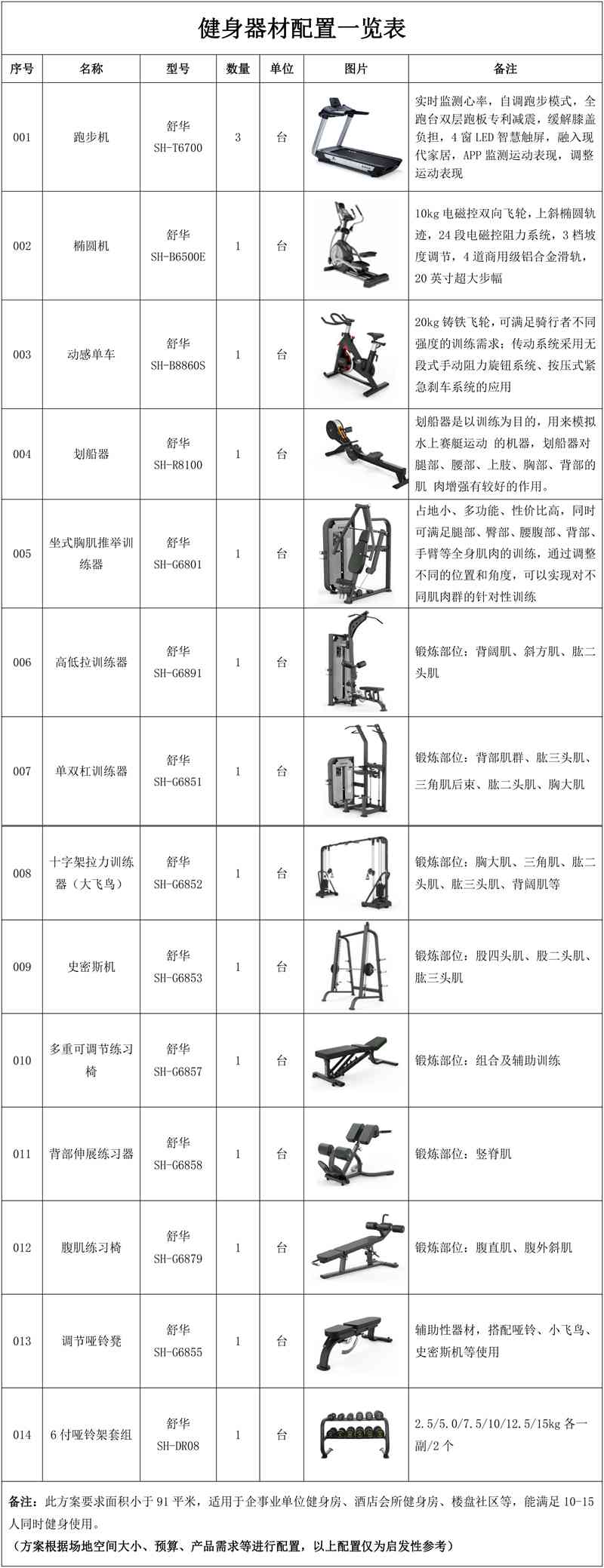 此方案要求面积小于91m²,适用于企事业单位、酒店会所、楼盘社区、学校等健身场所,能满足10-15人同时健身使用。(方案根据场地空间大小、预算、产品需求等进行配置仅为启发性参考)