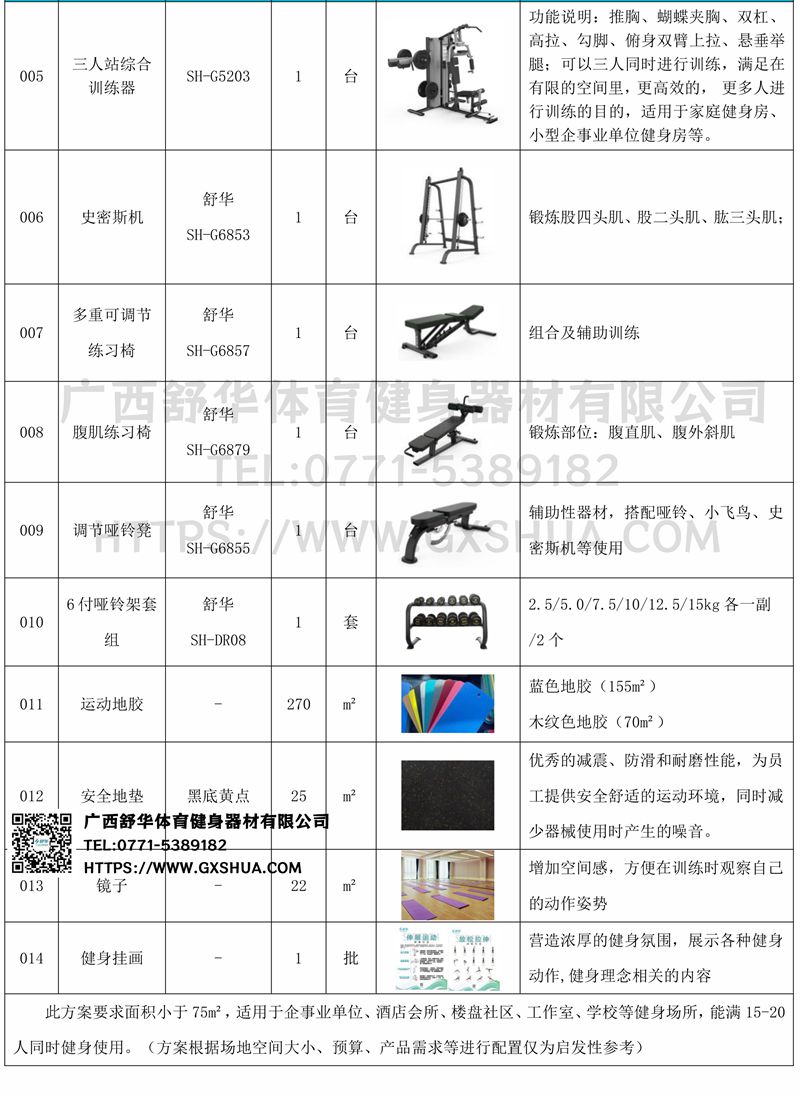 此方案要求面积小于75m²,适用于企事业单位、酒店会所、楼盘社区、工作室、学校等健身场所,能满10-15人同时健身使用。(方案根据场地空间大小、预算、产品需求等进行配置仅为启发性参考)