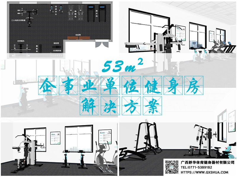 此方案要求面积小于53m²,适用于企事业单位、酒店会所、楼盘社区、工作室、学校等健身场所,能满10-15人同时健身使用。(方案根据场地空间大小、预算、产品需求等进行配置仅为启发性参考)