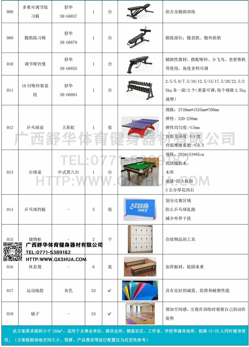 此方案要求面积小于188m²,适用于企事业单位、酒店会所、楼盘社区、工作室、学校等健身场所,能满15-25人同时健身使用。(方案根据场地空间大小、预算、产品需求等进行配置仅为启发性参考)
