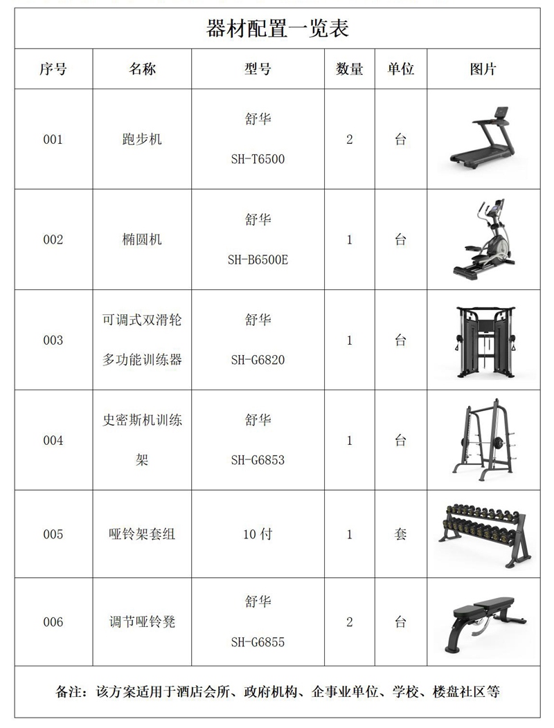 此方案要求面积小于40平米,KS体育会根据您个人的实际情况和场地面积而定。此方案推荐小型单位健身房、酒店会所健身房配置。能满足5-10人同时健身使用。