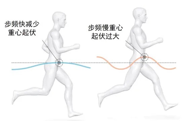 对于大众跑者来说,步频是衡量跑姿最简单最实用的指标,所谓步频就是指每分钟双脚着地的次数,步频乘以步幅就等于配速,在配速保持不变的情况下,跑者可以选择慢步频大步幅,也可以选择快步频小步幅,推荐大众跑者采用相对快的步频和相对小的步幅,因为快步频可以减少腾空高度,这样就减少落地时人体受到的冲击力。而如果采用慢步频大步幅式的跑步方式,一方面大大增加了腾空高度,跑步是水平向前的运动,跑者把大量力气用在克服重力做功方面,非常不经济,另一方面腾空高度越高,着地冲击越大,也大大增加了受伤风险。