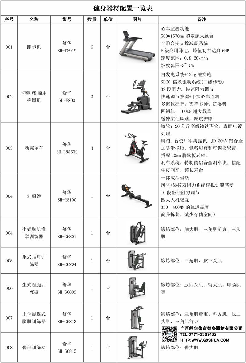 1.KS体育直播V9智能跑步机SH-T8919*6台-独立仪表-简洁大气,全新外观设计,健康运动新选择;心率监测功能,可通过手握心率、无线心率带等不同方式实时采集心率数据;580*1570mm超宽超大跑台-跑感舒适,跑台整体安全稳定;全跑台多支撑减震平台,保证跑台超强支撑力,达到180kg支撑,满足专业健身房需求。F级商用马达-超强马达,AC 3.0HP 交流,峰值功率达到6HP,F级商用品质。速度范围达到0.8-20km/h;V9跑步机可实现跑台扬升功能,坡度范围-3~15%,满足客户不同的锻炼需求。
