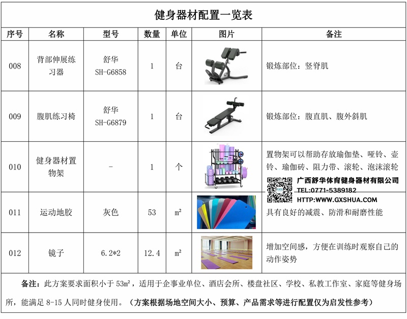此方案要求面积小于53m²,适用于企事业单位、酒店会所、楼盘社区、学校、私教工作室、家庭等健身场所,能满足8-15人同时健身使用。(方案根据场地空间大小、预算、产品需求等进行配置仅为启发性参考)