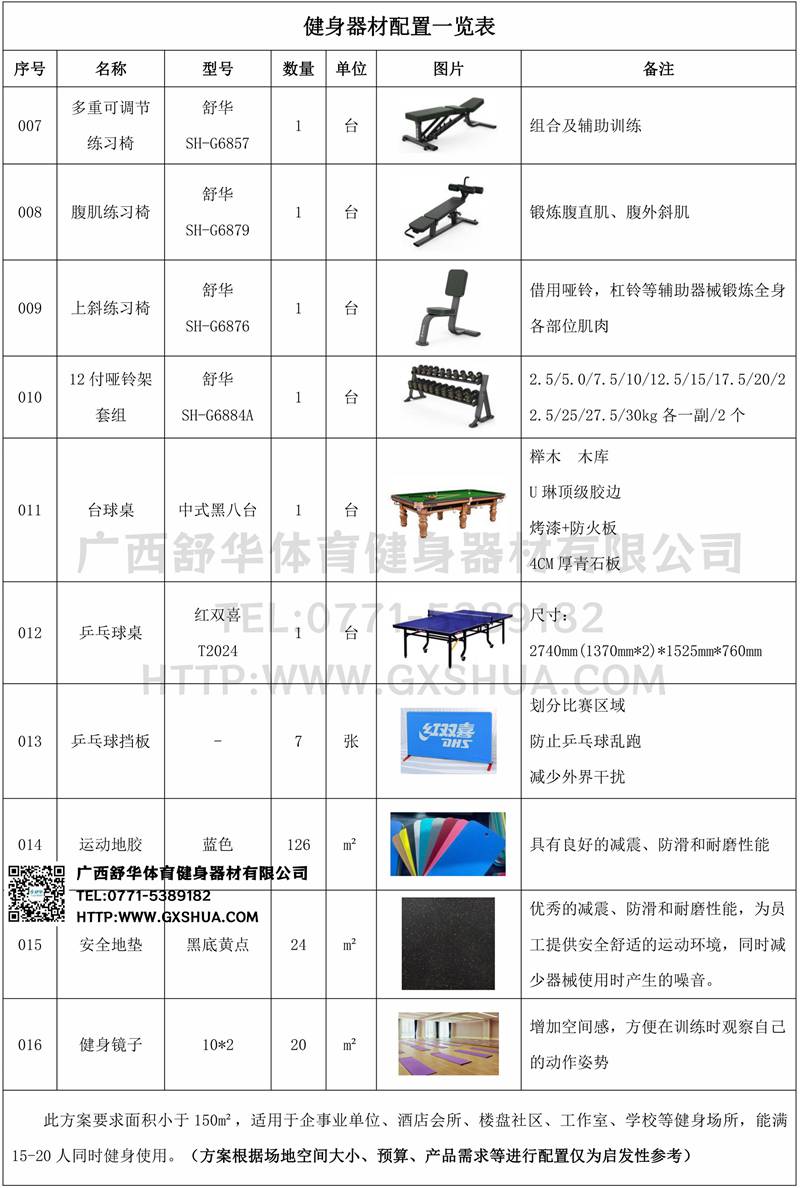 150m²企事业单位健身房根据客户需求及预算,有氧器材区域配置KS体育直播跑步机、椭圆机、动感单车,多元化的有氧器材能够有效提升心肺功能;力量器械配置综合训练器,可拓展多种训练方法,提供针对性训练、多种组合等训练方式,全方位激活身体机能。自由力量区域配置哑铃套组、腹肌训练器等满足多样化训练需求,促使健身训练更丰富。单位健身房配置台球桌、乒乓球桌,为员工的业余生活增添了乐趣和选择。与传统的健身器材锻炼相比,台球、乒乓球具有更强的娱乐性和趣味性,能够吸引更多员工参与到健身活动中来,提高健身房的使用率,让员工在工作之余有更多放松身心的方式。