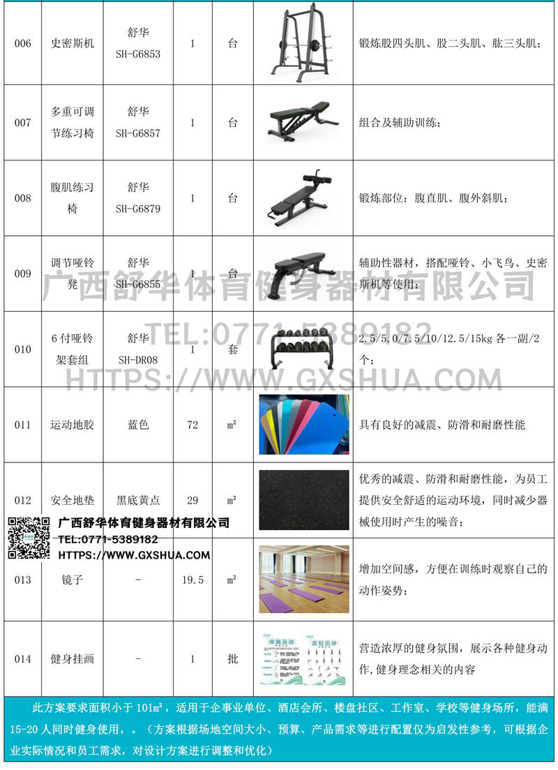 小飞鸟(1台),史密斯机(1台),多重可调节练习椅(1台),腹肌训练器(1台),6付哑铃套组(1套),可调哑铃凳(1张),可以实现对不同肌肉群的针对性训练,满足肌肉训练需求,全方位激活身体机能。