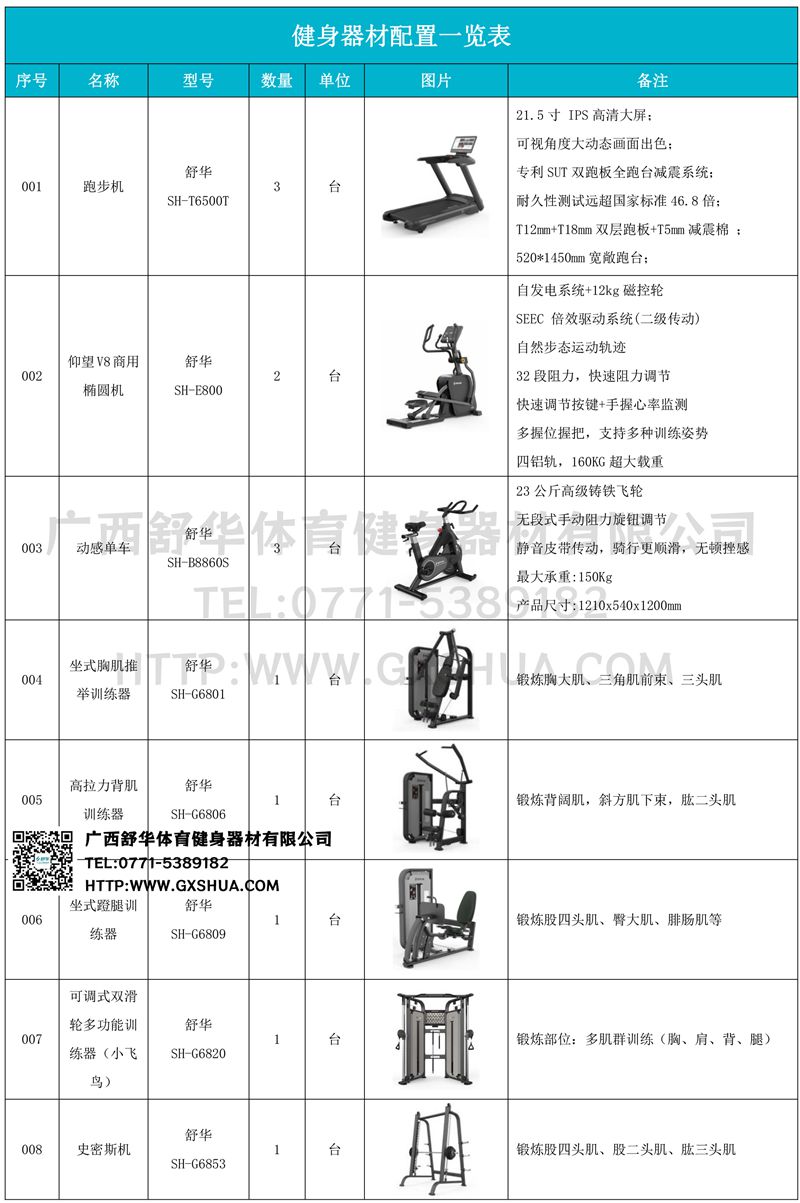 主要配置推胸、高拉背、蹬腿训练器、小飞鸟,可以锻炼胸、肩、背、腿等各部位的肌肉,满足使用者全身锻炼的需求,满足在有限的空间里,更高效的, 更多人进行训练的目的。